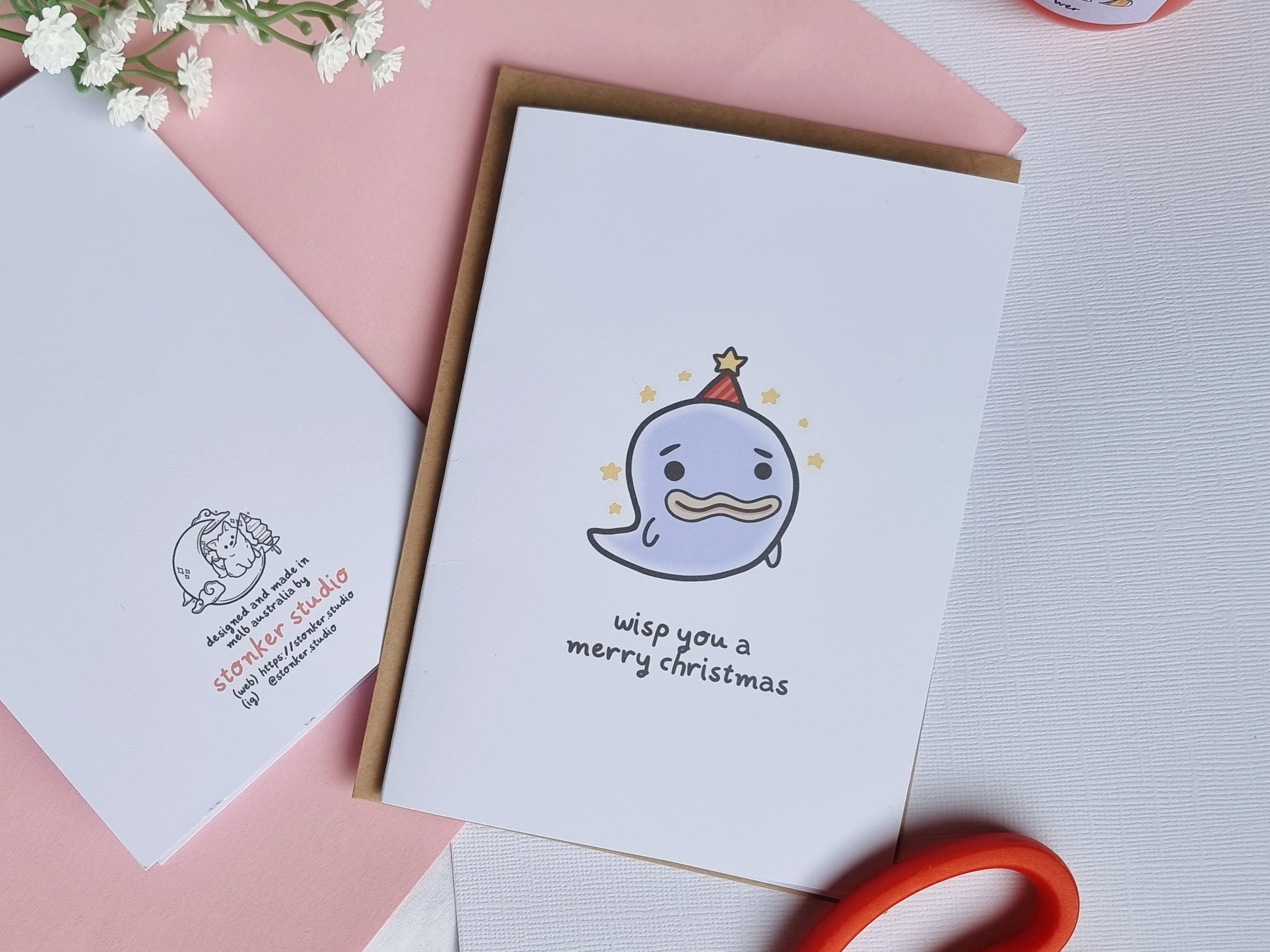Wisping you a merry Christmas. Made of 300gsm acid-free uncoated paper, an A6 size (105x148mm). They are blank inside, so you can write your own special message. Envelope included.